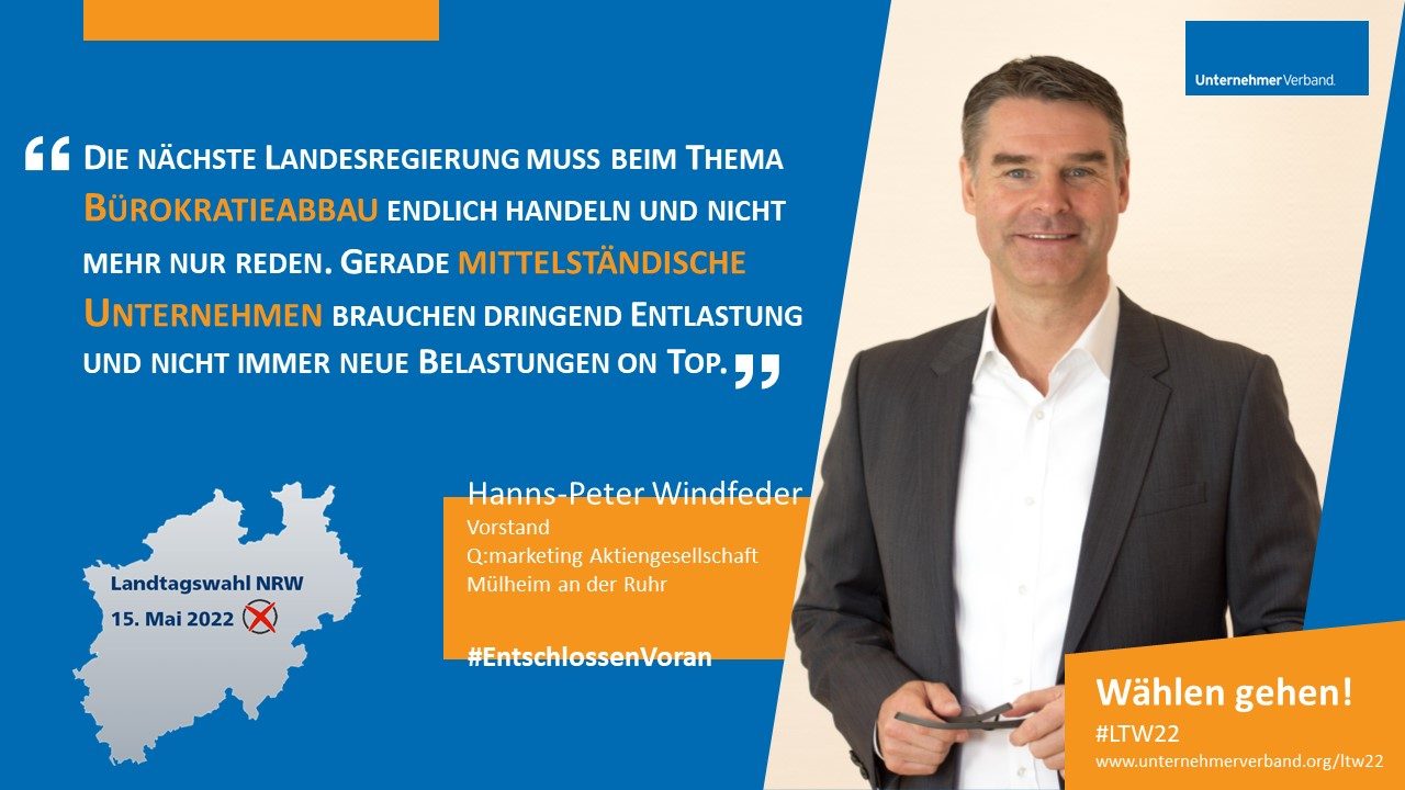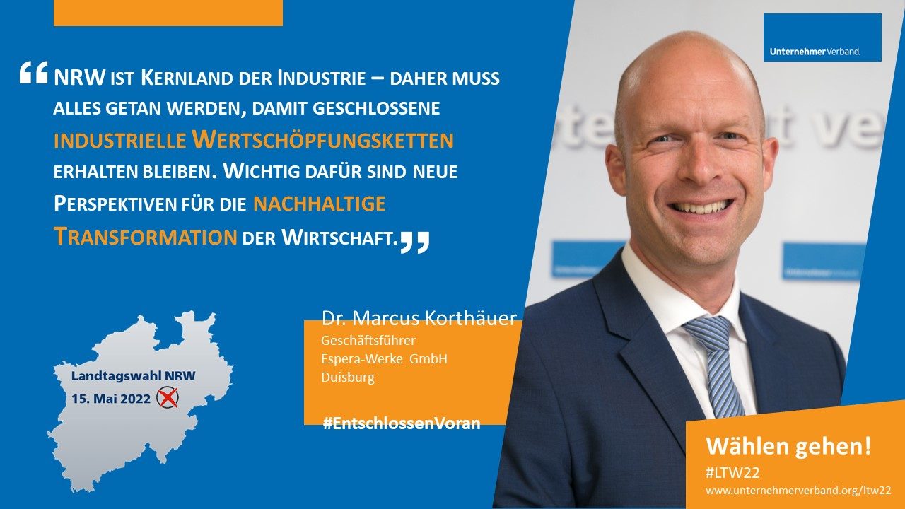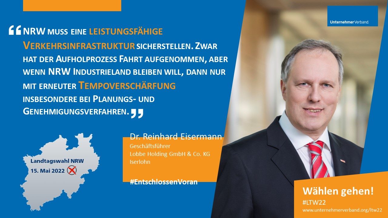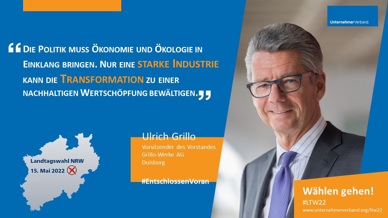 Von einer neuen Landesregierung fordere ich, dass sie alles tut, damit Nordrhein-Westfalen ein starkes Land bleibt, um Wirtschaft zu stärken und Wohlstand und Arbeitsplätze zu sichern. Wir brauchen hierzulande Vorfahrt vor Innovationen und Investitionen. Und auch wenn die Zeiten weltweit ruppig sind, dürfen wir die Aufgaben hier bei uns zu Hause nicht aus den Augen verlieren.
