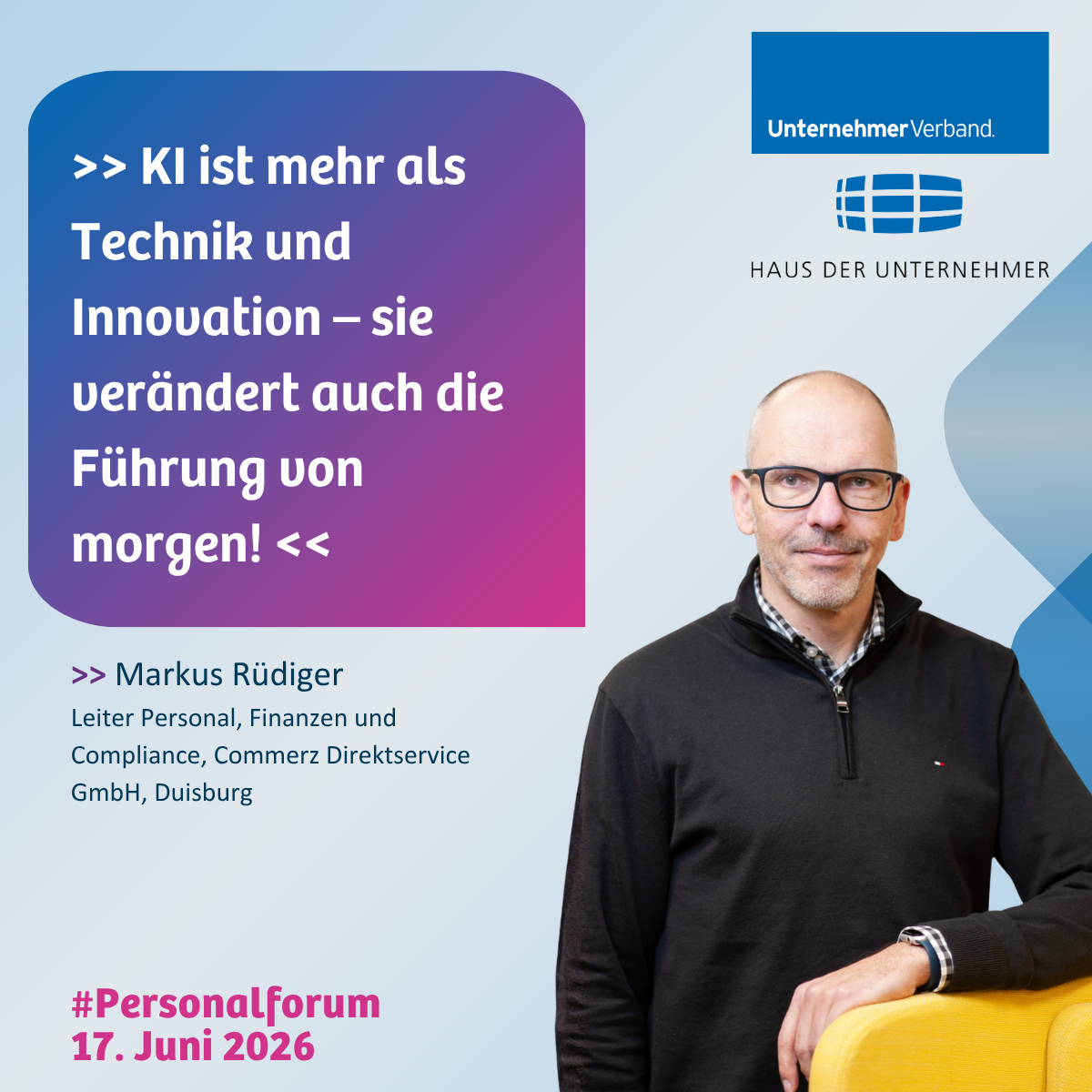 Markus Rüdiger verantwortet im Commerz Direktservice die Bereiche Personal, Finanzen und Compliance. Dabei beinhaltet der HR-Bereich das gesamte Spektrum des Employee-Lifecycles von On- bis Offboarding genauso wie Grundsatzthemen, Marketing und Controlling. Die Anforderungen an Führung kennt er aus verschiedenen Perspektiven – als Vertriebsführungskraft der Commerzbank genauso wie als Leiter Personal. Er zeigt auf, welche Anforderungen an Führung aus der disruptiven KI-Entwicklung entstehen, wie der Commerz Direktservice diese Anforderungen bewältigt und welche weiteren Maßnahmen für eine Transformation in die KI-Welt von morgen nötig sind.