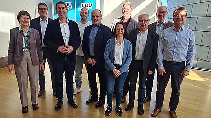 Foto 1: Unternehmerinnen und Unternehmer der Sozialwirtschaft im Dialog mit Kita-Fachleuten der CDU-Fraktion im Landtag (von links): Elisabeth Schulte, Jörg Olthues, Jens Kamieth MdL, Justus Behmenburg, Michael Reichelt, Verena Birnbacher, Rolf Wöste, Karl-Heinz Theußen, Daniel Hagemeier MdL und Eberhard Gröh. (Foto: Manfred Hemmersbach)