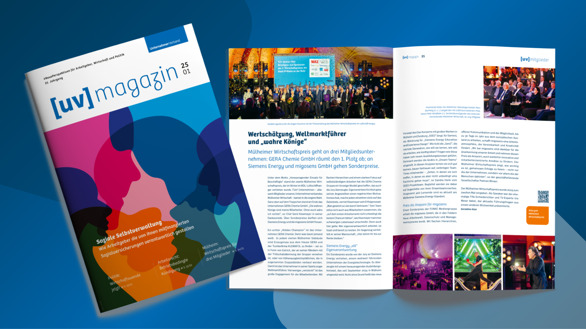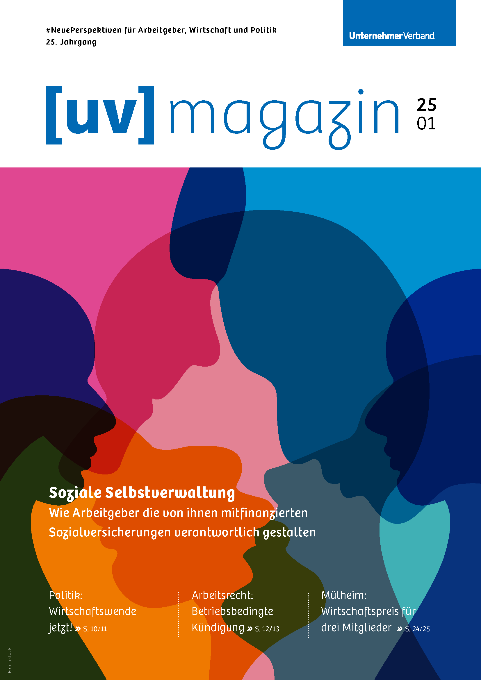 In dieser Ausgabe unseres neuen [uv]magazins lesen Sie Reportagen aus bzw. Interviews mit unseren Mitgliedsunternehmen, einen Arbeitsrechtsbeitrag zur betriebsbedingten Kündigung, Best-practice zur Fachkräfte-Sicherung und außerdem Neuigkeiten aus dem Verbandsleben. Im [uv]fokus steht als unser Titelthema die unternehmerische Selbstverwaltung in den Sozialversicherungen.