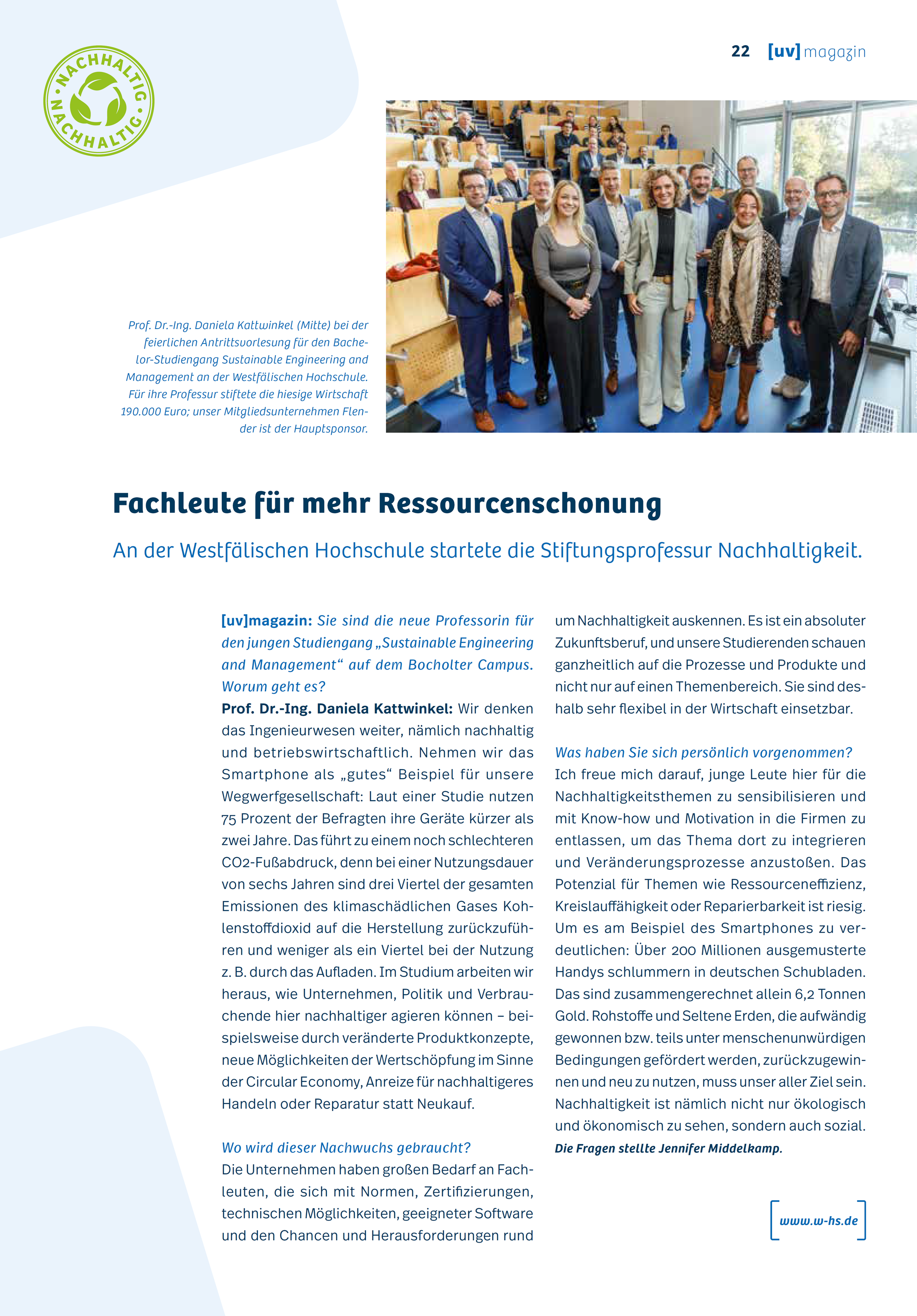 Prof. Dr.-Ing. Daniela Kattwinkel: Die Unternehmen haben großen Bedarf an Fachleuten, die sich mit Normen, Zertifizierungen, technischen Möglichkeiten, geeigneter Software und den Chancen und Herausforderungen rund um Nachhaltigkeit auskennen. Es ist ein absoluter Zukunftsberuf und unsere Studierenden schauen ganzheitlich auf die Prozesse und Produkte und nicht nur auf einen Themenbereich. Sie sind deshalb sehr flexibel in der Wirtschaft einsetzbar.
