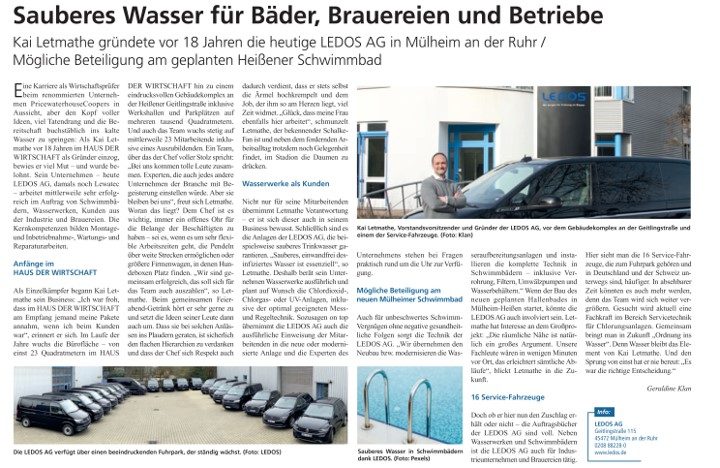 Eine Karriere als Wirtschaftsprüfer beim renommierten Unternehmen PricewaterhouseCoopers in Aussicht, aber den Kopf voller Ideen, viel Tatendrang und die Bereitschaft buchstäblich ins kalte Wasser zu springen: Als Kai Letmathe vor 18 Jahren im HAUS DER WIRTSCHAFT als Gründer einzog, bewies er viel Mut – und wurde belohnt. Sein Unternehmen – heute LEDOS AG, damals noch Lewatec – arbeitet mittlerweile sehr erfolgreich im Auftrag von Schwimmbädern, Wasserwerken, Kunden aus der Industrie und Brauereien. Die Kernkompetenzen bilden Montageund Inbetriebnahme-, Wartungs- und Reparaturarbeiten.